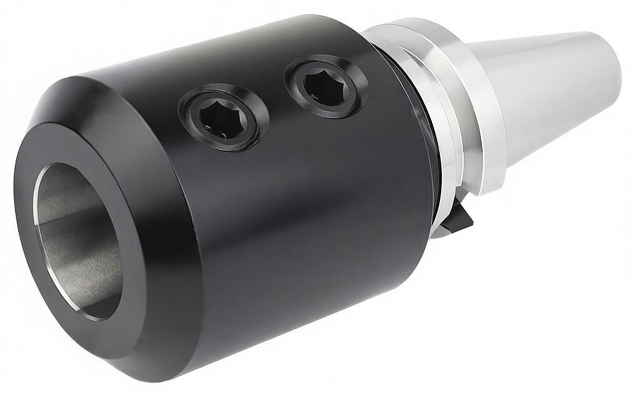 Конус по стандарту MAS403 BT50. Внутреннее отверстие диаметром 25 мм предназначено для установки фрез и другого инструмента с цилиндрическим хвостовиком, оснащённым боковой лыской (по DIN 1835-B и DIN 6535-HB). Фиксация инструмента обеспечивается двумя винтами с шестигранным приводом, которые упираются в лыску, надёжно предотвращая проворот. Вылет от базовой поверхности шпинделя — 100 мм. Точность центрирования: радиальное биение не превышает 0,005 мм.